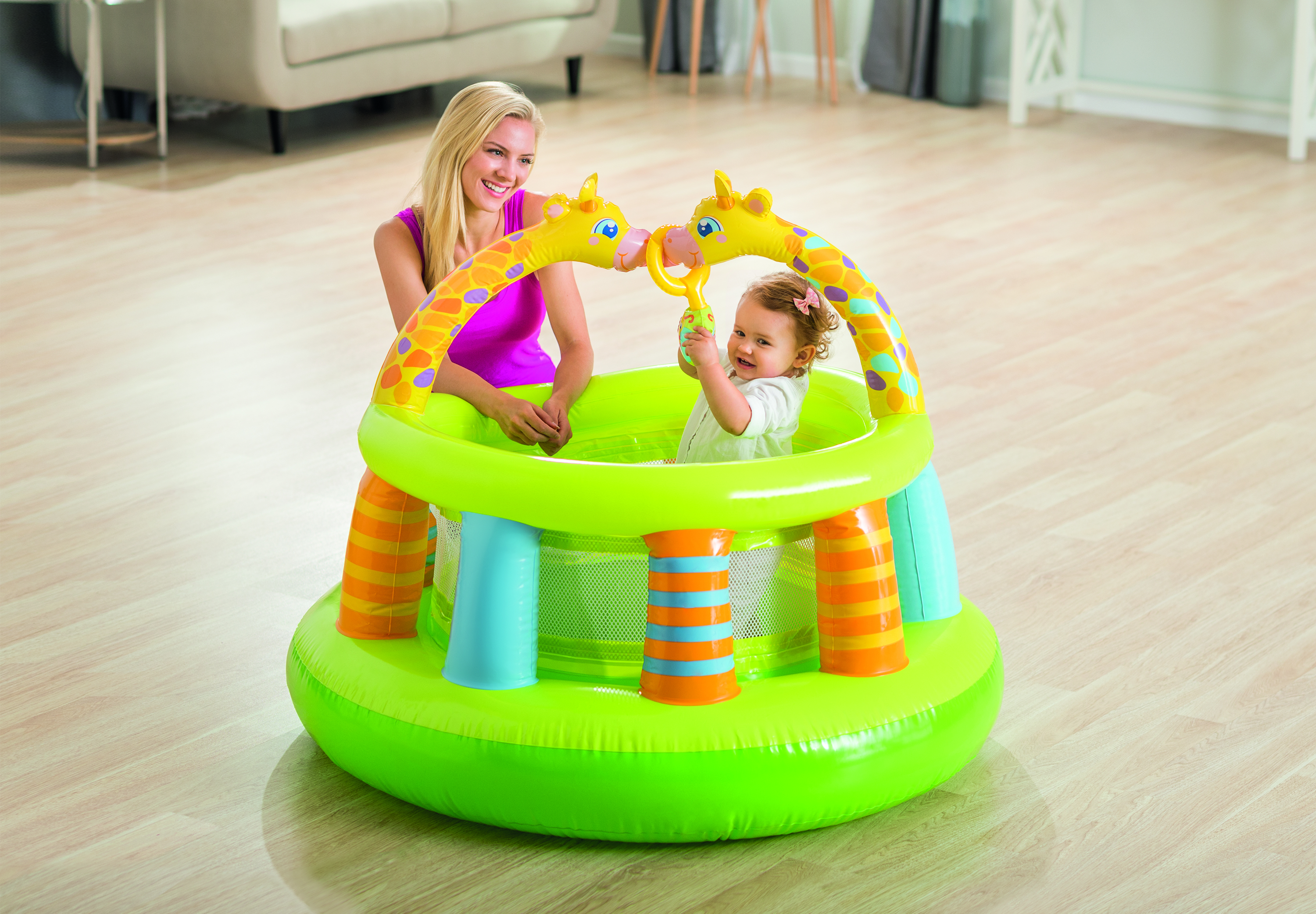 Надувной центр-манеж "My First Gym" Intex 48474 - манеж для самых маленьких (до 1,5 лет). В нем есть висящие надувные игрушки с мячиками-погремушками, чтобы ребенку не было скучно. Находясь и играя в этом манеже, он будет в полной безопасности, благодаря высоким и мягким боковым стенкам и надувному полу. Окна из полупрозрачной сетки в боковых стенках позволяют родителям следить за ребенком - отличное приобретение для молодой семьи.